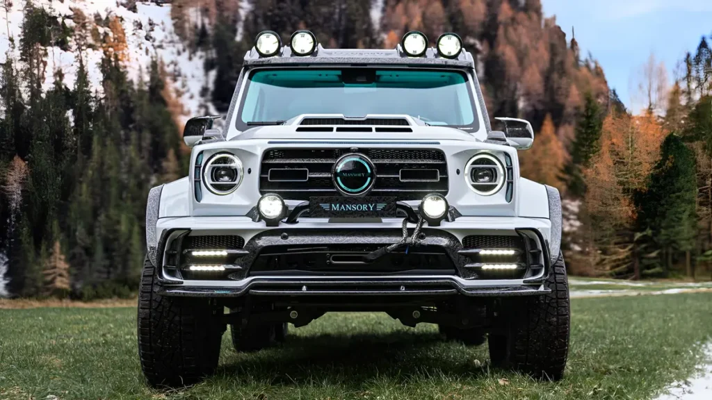 Lighting should feature next-gen LEDs with distinctive signatures front and rear, plus an optional roof-mounted light bar for desert runs. Exterior finishes range from satin stealth tones to exposed-weave carbon, with color-coded brake calipers and custom wheel finishes. As always with Mansory, buyers can commission one-off paints, graphics, and inlays to make their truck truly singular.